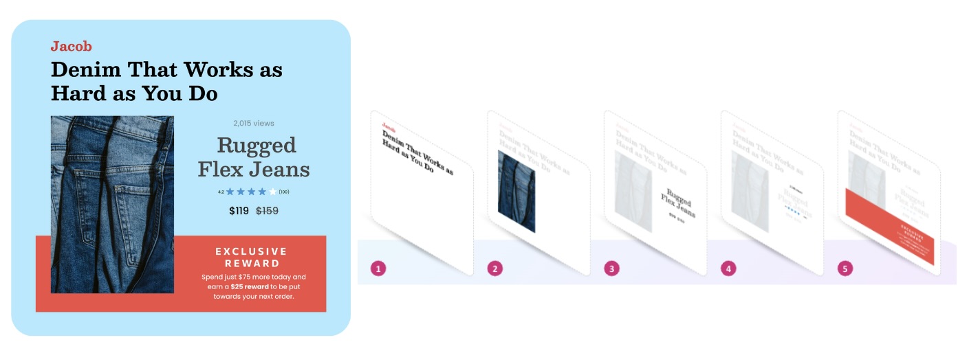 Every time a customer re-engages, the content automatically refreshes to reflect any changes in their context or in your business since the last interaction. If a product has already been purchased, it’s swapped out. If pricing, inventory, or ratings change, the experience updates instantly, no campaign redeploy required.