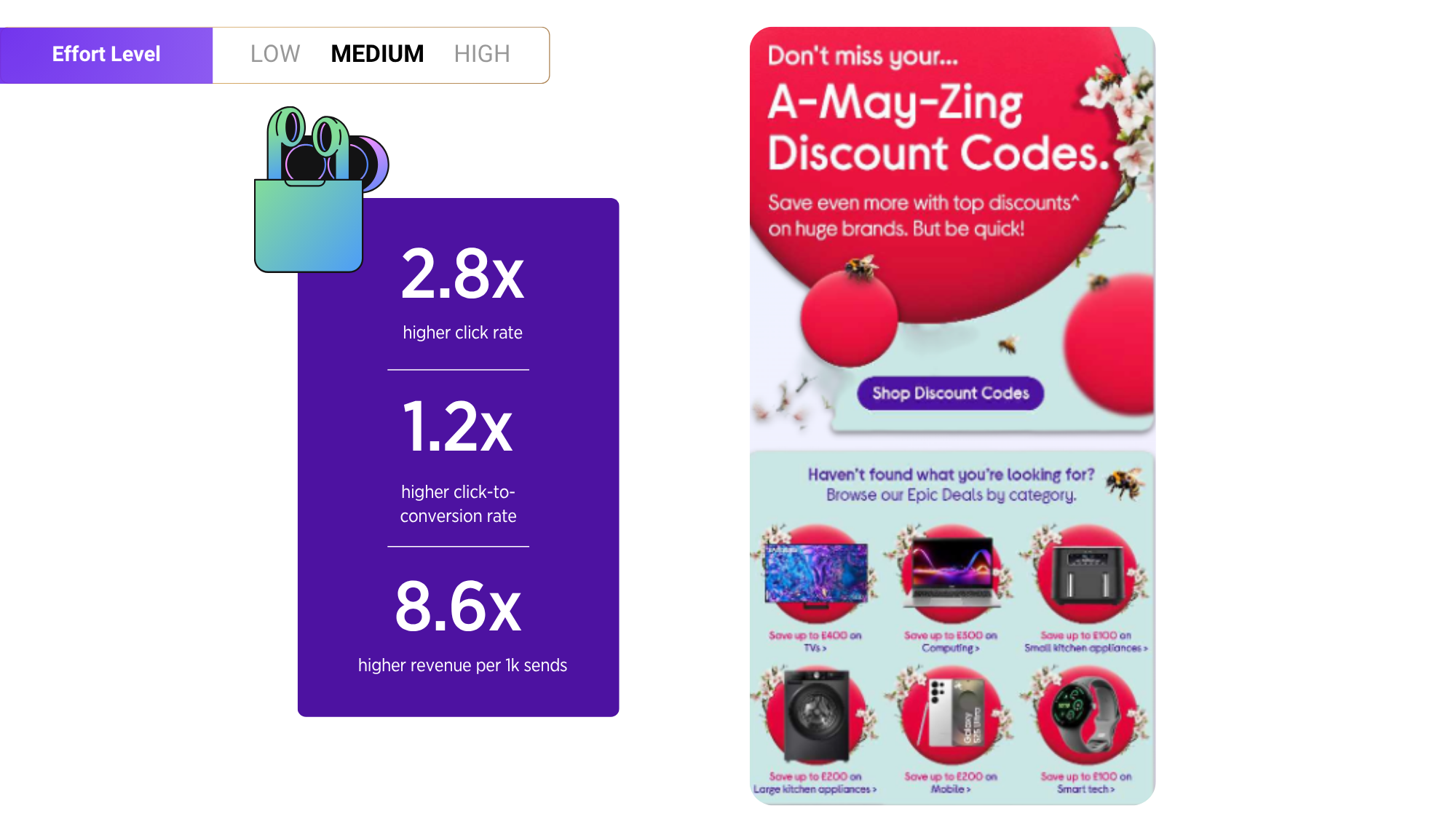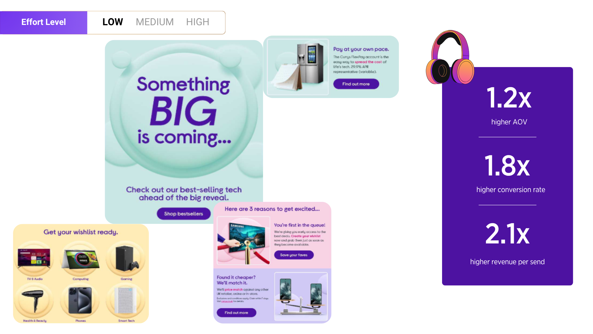 Using Da Vinci, Currys targeted the right recipients for this creative while balancing engagement across their other assets. What initially seemed low-potential became one of their most effective pieces, achieving the highest click-to-conversion rate and the third-highest AOV in their library.